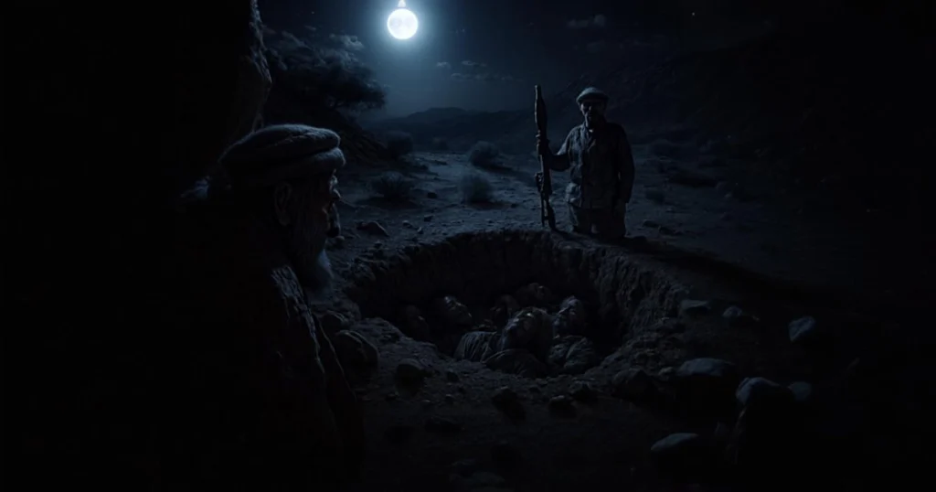 این تصویر ادامه مییابد. سلطانی به فرمان جعفری و حسینی از راههای کوهستانی پشتبند و پیشبند به سمت قینر میرود تا بالاخره به قرارگاهی در دامنههای دشت خواجهالوان برسد. راهی طولانی، بدون اینکه آن را بلد باشد. همه چیز برایش تازگی دارند، حتی گلههایی از خوک که با بچههای خود از کنارش میگذرند و او وقتی برای حفاظت جان خود از تفنگچهی پاکستانی همراهش استفاده میکند، تفنگچه کار نمیکند؛ صدا نمیکند؛ … خوکها به او کار نمیگیرند، اما معلوم است که چقدر خون او و غلام علی سرخ را خشک کردند. کمی آنسوتر، تپهای که روی آن تخت سنگی پادشاه چونغار نصب است، کمی آنسوتر، گودالی که بیش از یک صد و هشتاد نفر از قتلعام شدگان جنگآغلی زیر خاک شده و کفش و کلاه و لنگیهای شان هنوز در محل باقی مانده است….