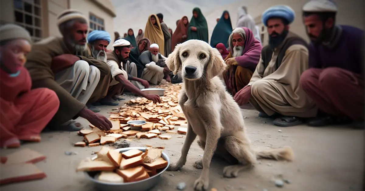 روزی مردم قریه، نذر کرده بودند. نذر شان نان پتیر/فطیر بود که ما آن را در هزارگی «تیکی» می‌گوییم. همه‌ی مردم پیش قریه جمع شده بودند تا تیکی را تقسیم کنند و بخورند. سگ آبی پرزی هم آمده بود و آن طرف‌تر دو پای خود را پیش گذاشته و روی دو پای دیگر خود روی زمین دراز کشیده بود و به مردم نگاه می‌کرد. معلوم بود که از گرسنگی درد می‌کشید. یکی از مردمان قریه گفت: خوب است یک پتیر کامل را برای سگ آبی پرزی بدهیم که گرسنه است و ثواب می‌شود.